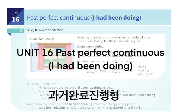 UNIT 16 Past perfect continuous (I had been doing) 과거 완료 진행형 UNIT 16 Past Perfect Continuous (I had been doing) 과거완료진행형 A Example Situation Yesterday morning I got up and looked out of the window.어제 아침에 나는 일어나서 창문 밖을 내다보았다. The sun was shining, but the ground was very wet.햇빛은 비치고 있었지만, 땅은 매우 젖어 있었다. It had been raining.비가 내렸던 상태였다. It was not raining when I looked out of the window. 내가 창문 밖..