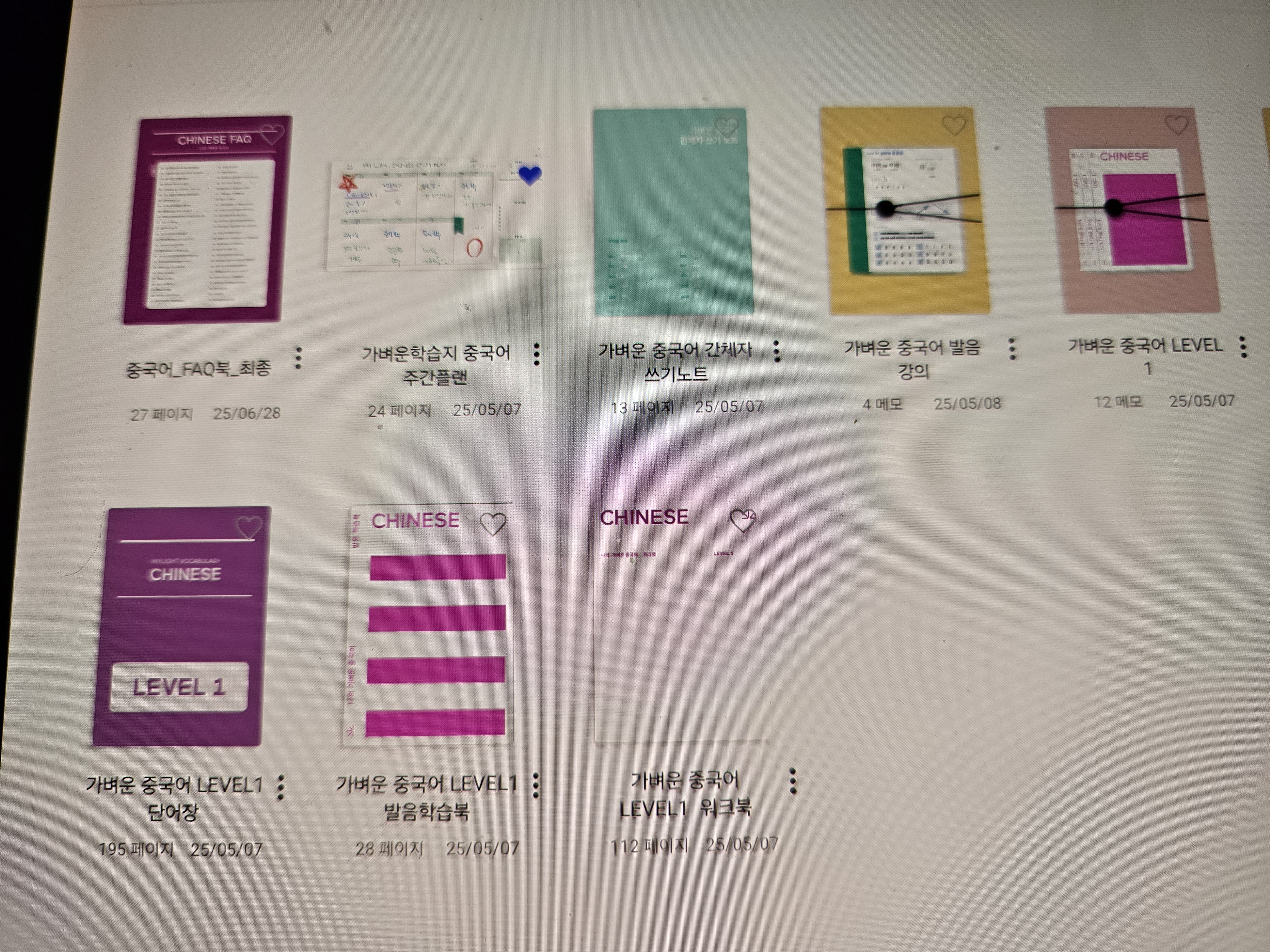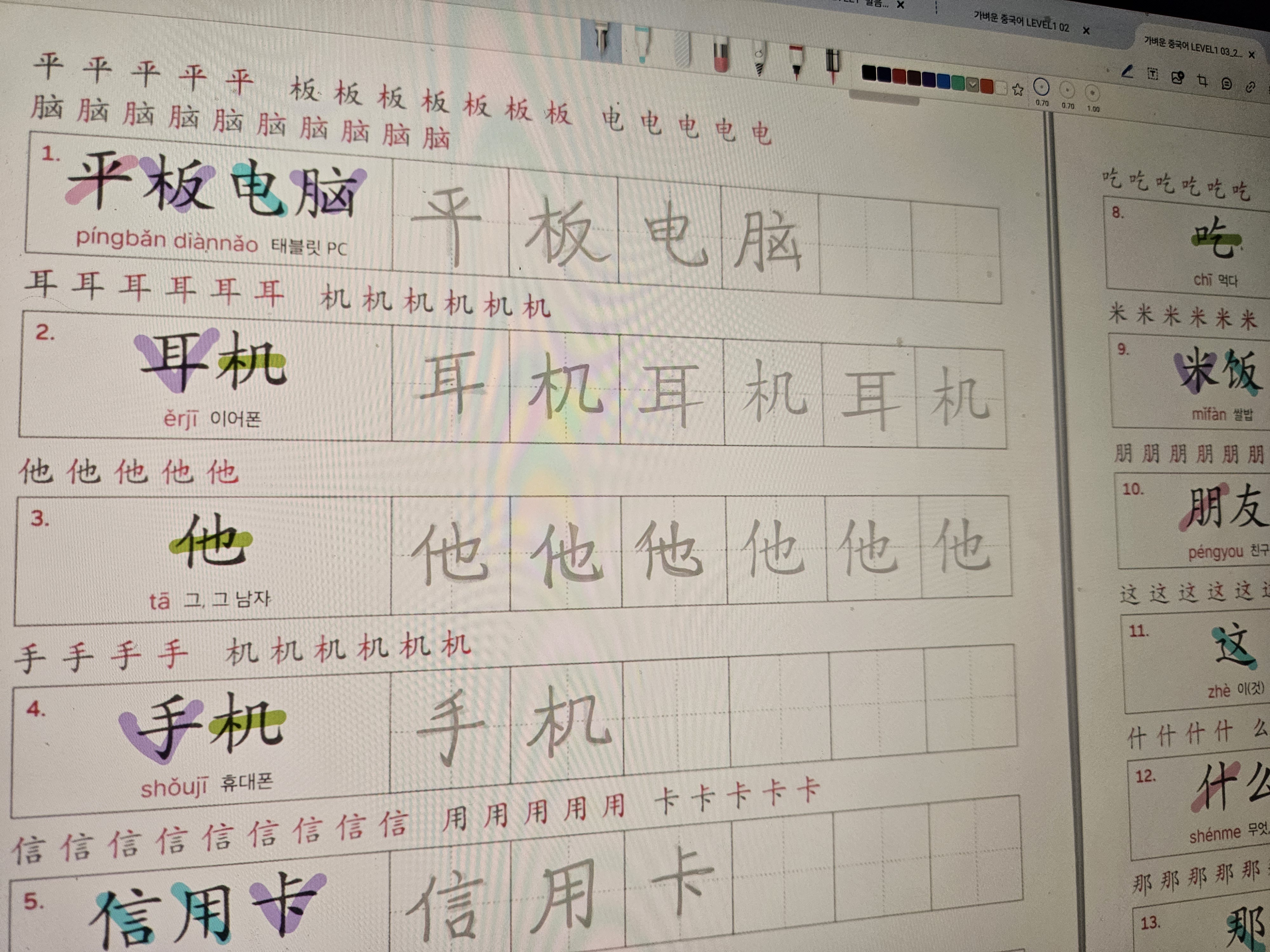 거의 대부분 태블릿으로 가벼운학습지 앱에서 디지털 교재로 공부하거나 다운받아둔  PDF 교재로 중국어 공부를 하고 있다.
