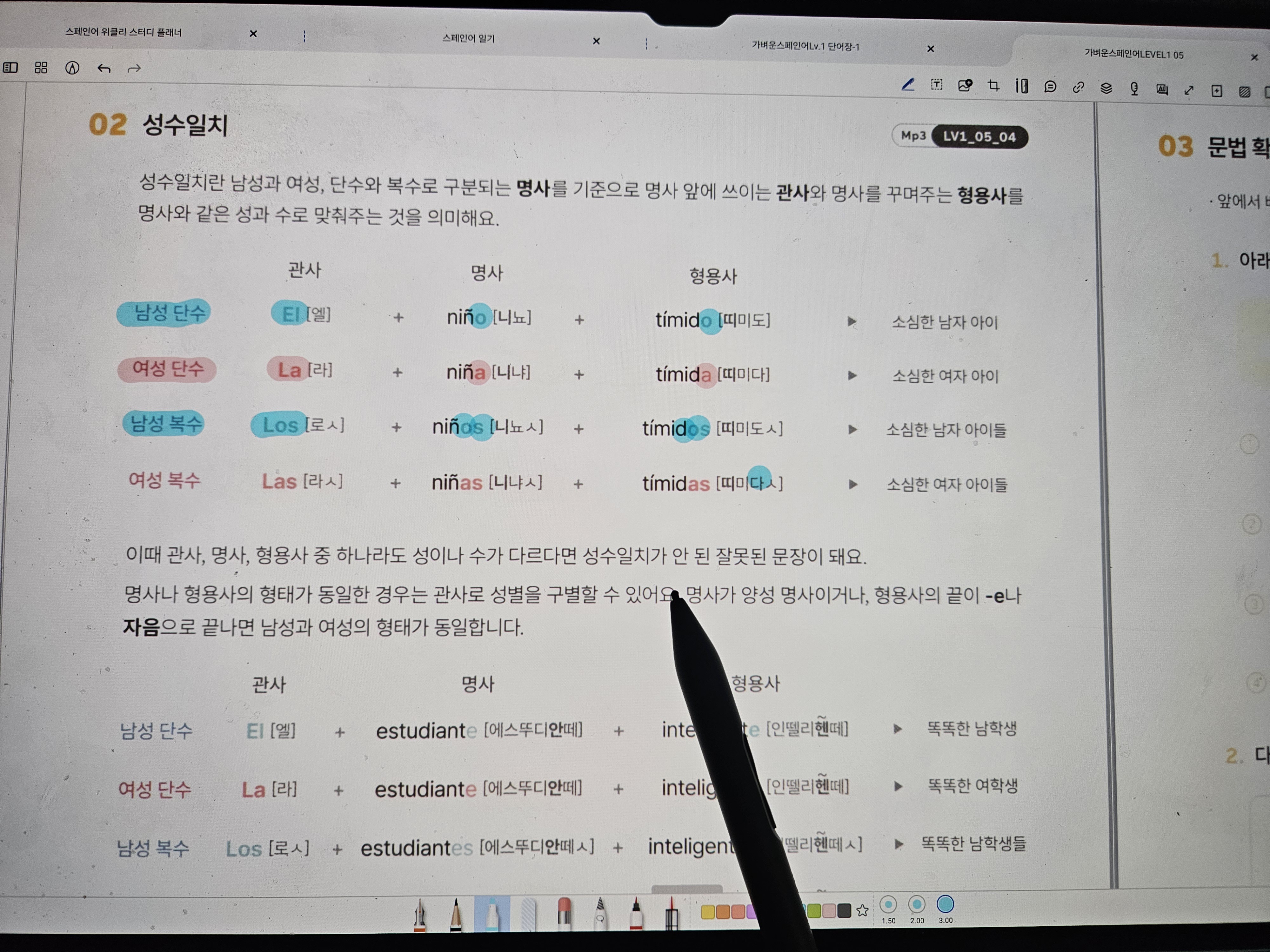 왜냐하면 스페인어는 강세 규칙도 있어서 신경 써야 하고, 성별 문제가 있어서 명사뿐 아니라 관사·형용사도 같이 변하기 때문이다.