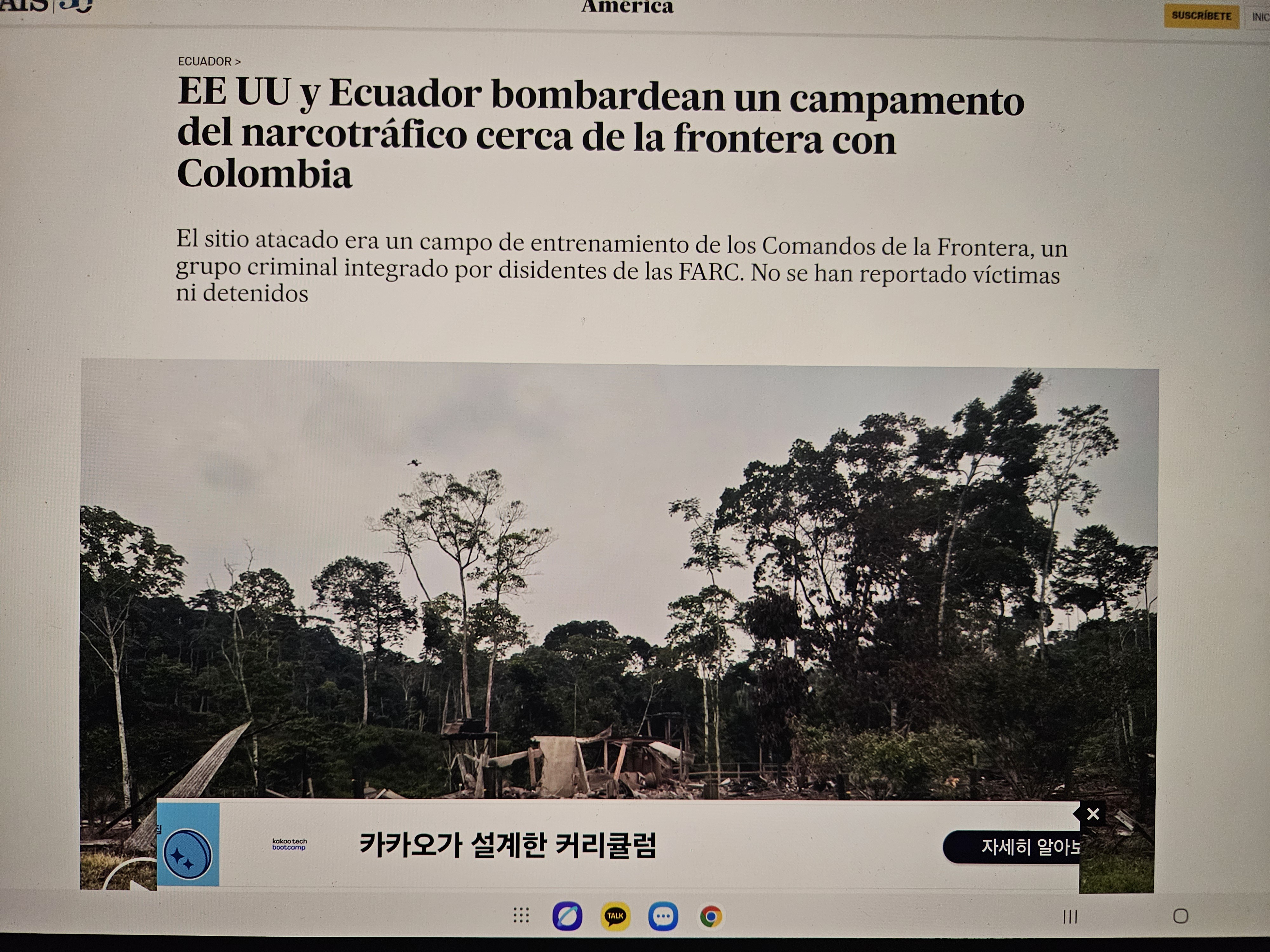 미국과 에콰도르가 콜롬비아 국경 인근의 마약 밀매 캠프를 폭격했다는 기사이다.