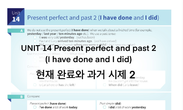 UNIT 14 Present perfect and past 2 (I have done and I did) 현재 완료와 과거 시제 2 A 현재완료는 완료된 시간에 대해 사용하지 않음 완료된 시간을 언급할 때 과거형 사용 - 현재완료를 사용하지 않는 경우- 어제, 작년, 십 분 전과 같은 “완료된 시간”을 말할 때는 현재완료 대신 과거형을 사용해야 함.- 이유는 현재완료는 과거와 현재를 연결하는 시제인데, 특정한 완료된 시간을 언급하면 과거형으로 끝난 사건이기 때문임. 예문It was very cold yesterday.어제는 매우 추웠어.- 어제라는 특정 시간을 언급했기 때문에 과거형을 사용.- has been을 쓰지 않음. Paul and Lucy arrived ten minutes ago.폴과 루시는..
